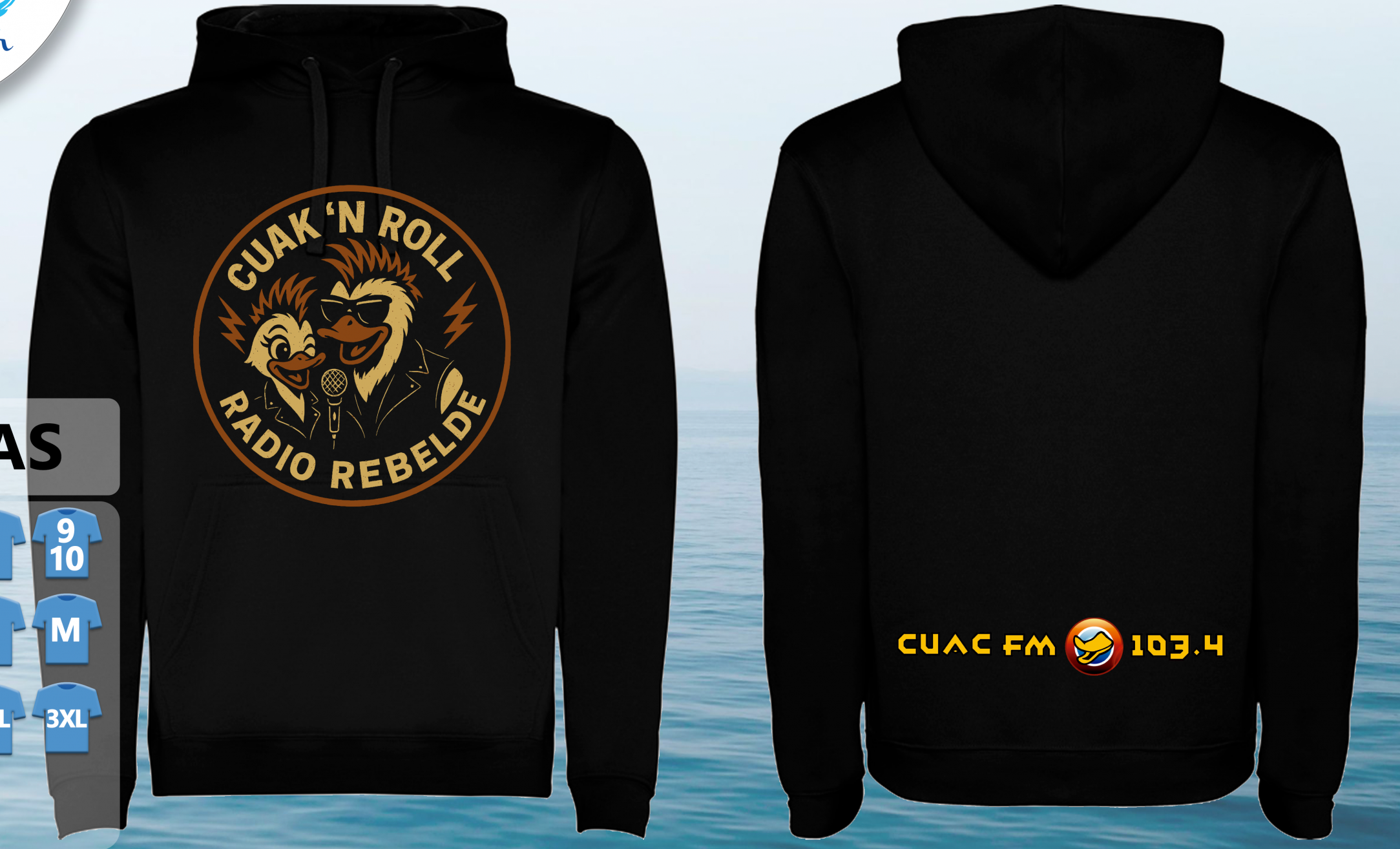Una sudadera pensada para representar la comunidad de la emisora y el espíritu del rock, llevando siempre contigo la identidad de Cuak ’N Roll y de Cuac FM. 🎶📻